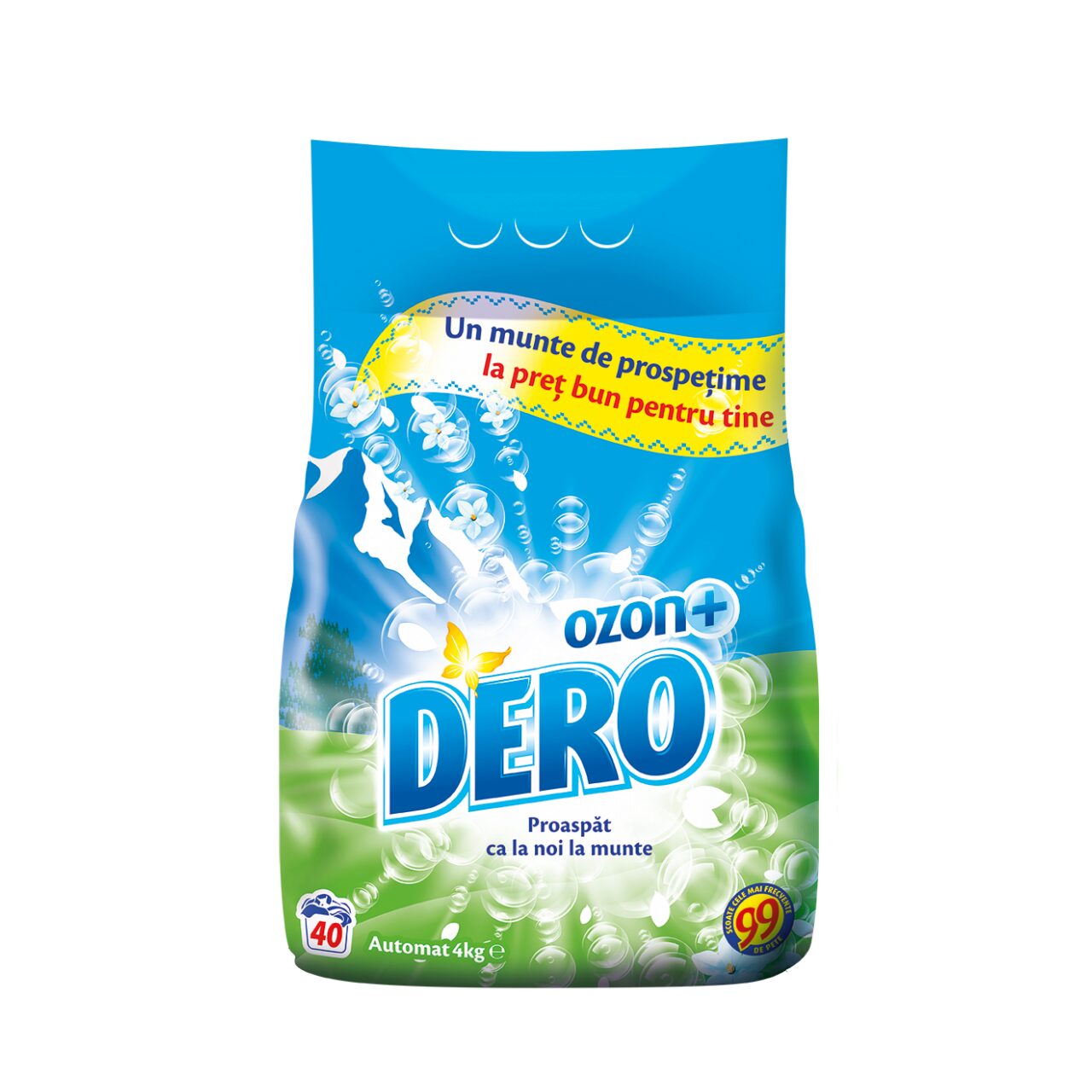 DERO Ozon+ are o formula eficienta cu oxigen activ care spulbera cele mai frecvente 99 de pete, oferind in acelasi timp hainelor tale prospetimea care dureaza mult, mult timp. Spalatul rufelor devine mai usor ca oricand. Puterea lui DERO este la fel de proaspata chiar si la temperaturi mici.